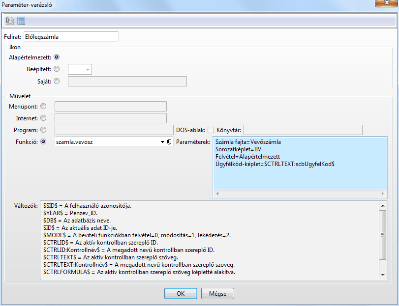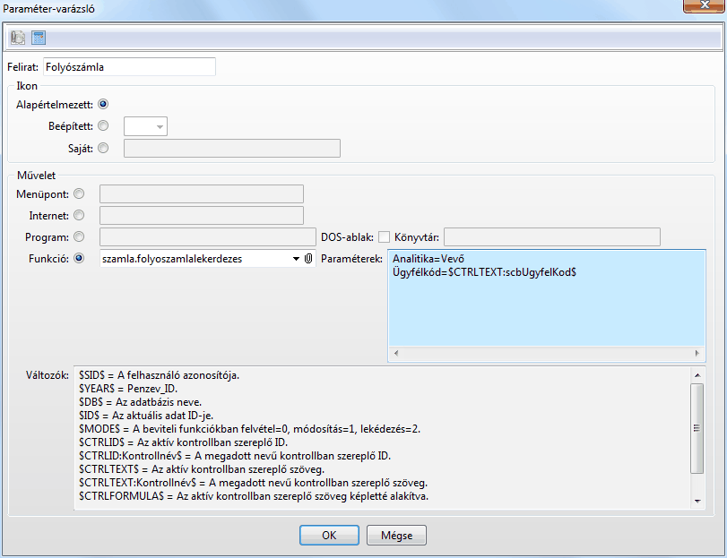 A bevitelekben a Felvétel, Módosítás, Lekérdezés paramétereknek az egyik lehetséges értéke: Alapértelmezett. Ha az egyik üzemmódnál ez van beállítva, akkor nem az utoljára használt üzemmódban indul el az indított funkció, hanem a beállítottban. Így a nyomógombnál ezt kell beírni: Felvétel=Alapértelmezett