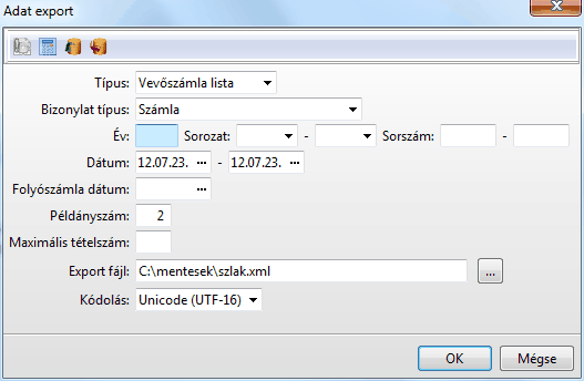 Vevőszámla bevitelből az Adatexport funkció elindítása a számla dátumának átadásával az exportálási tól / ig dátumtartományba: