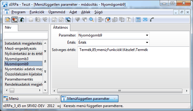 Ez a paraméter szabályozza, hogy az aktuális menü funkcióiban, megjelenjen-e az ikonsorban egy új nyomógomb, amelyről a sERPán belüli menü, funkció, vagy külső (böngésző, vagy exe) programok elindítása történhet funkciófüggő paraméterátadással. A menüparaméter neve Nyomógomb1 ... Nyomógomb9 lehet, tehát egy funkcióba összesen maximum 9 belső funkcióindító / külső programindító ikon tehető ki.