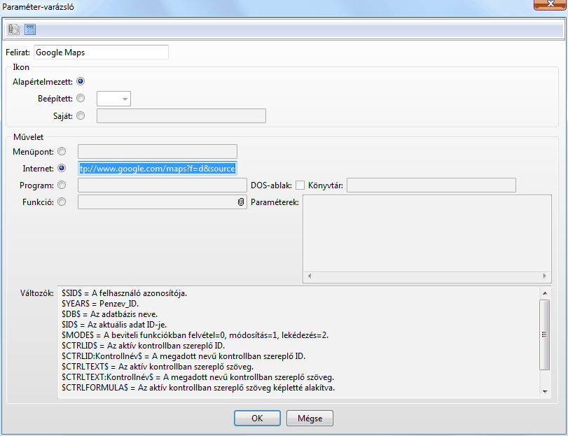 címke a gombon megjelenítendő felirat szövege. Gombnév, amely az ikonra közelítéskor kiírásra kerül, utána vesszővel megadható az ikonleíró, ami lehet az ikon belső sorszáma, vagy egy minden kliens számára elérhető ikonfájl elérési úttal megadva. Utána pontosvessző, majd szóköz nélkül következik a meghívott program php címe (www.xxx.hu), majd a többi átadandó paraméter.