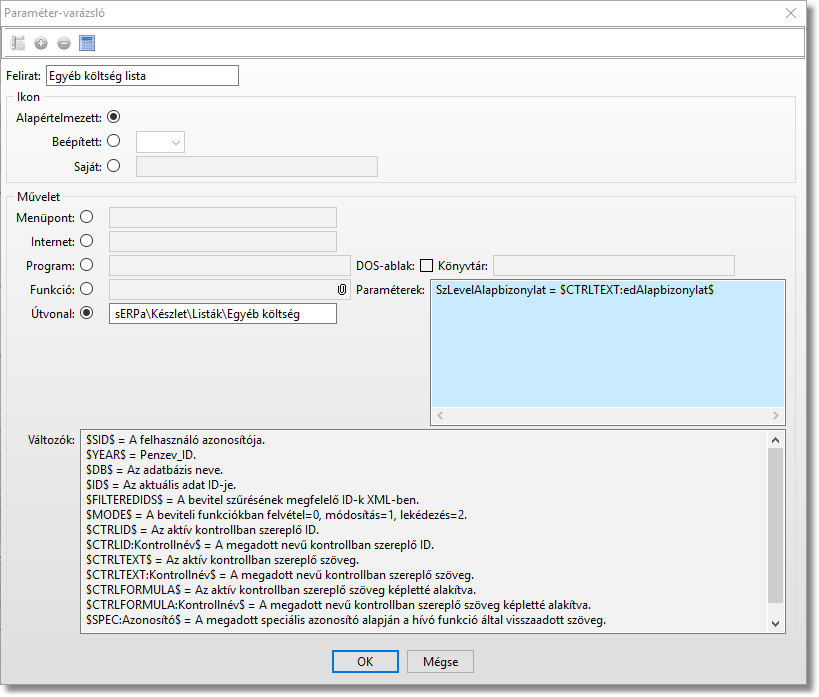 Az útvonal nagyon hasonlít a Menüponthoz, az útvonalnál is a grafikus menü útvonalát kell megadni. A menü nevét (sERPa\) el lehet hagyni. Annyiban különbözik a Menüpontban megadható beállítástól, hogy az útvonal paraméterezhető. Akkor hasznos, ha például egy automatikus listát szeretnénk elindítani nyomógombbal, és szeretnénk kezdő paramétert adni a listának.