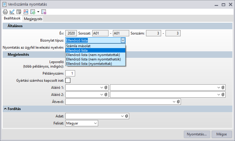 Tiltott esetén vevőszámla nyomtatásánál tiltja a "Számla" típusú nyomtatást.(Nem lehet kiválasztani azt, mint bizonylat típus).