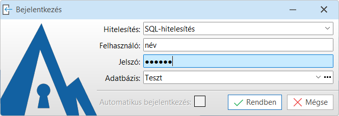 •Windows hitelesítés esetén a kliensgépre bejelentkezett felhasználó a szerveren használt felhasználói névvel és jelszóval juthat be a programba, azok ismételt begépelése nélkül a számára engedélyezett adatbázisba. Windows hitelesítés nélküli belépés csak akkor sikeres, ha a felhasználói név és jelszó a kiválasztott adatbázisra is megadásra került (SQL szerver oldalról).