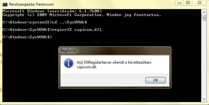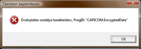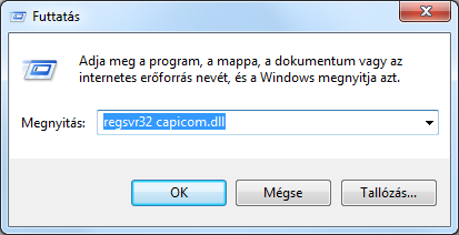regsvr32 capicom.dll (64bit-es op. rendszer esetén 32bit-es parancssorból kell indítani, vagy a c:\Windows\SysWOW64\ könyvtárból futtatva)