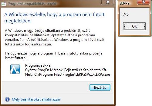 Ha 740 hibaüzenetet kapunk, akkor a sERPa telepítő megosztás (hálózati megosztás) nem elérhető, (ez gyakran akkor fordul elő, ha bejelentkeztünk a Windowsba (Vista, és 7 estén) és indítjuk a sERPát, anélkül, hogy a Windows a háttérben betöltötte a hálózati helyeket.) ekkor indítsuk el újra a sERPát.