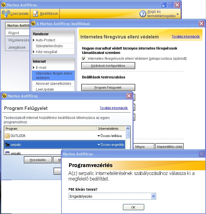 A Norton Antivírus program is gátolhatja a licenszkiszolgáló kommunikációját. A Norton AntiVirus 2005 programban például a Beállítások > Internet > Internetes férgek elleni védelem > Program Felügyelet menüpontnál ki kell választani a serpalic-et, és a Módosítás gomb megnyomása után válasszuk ki az Engedélyezést, majd mentsük el a beállítást.