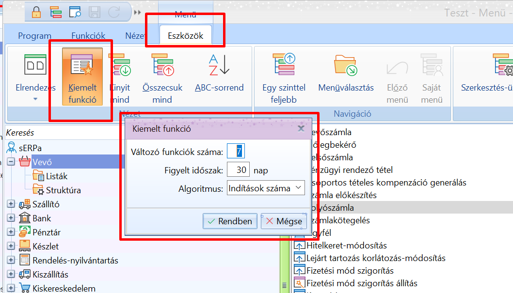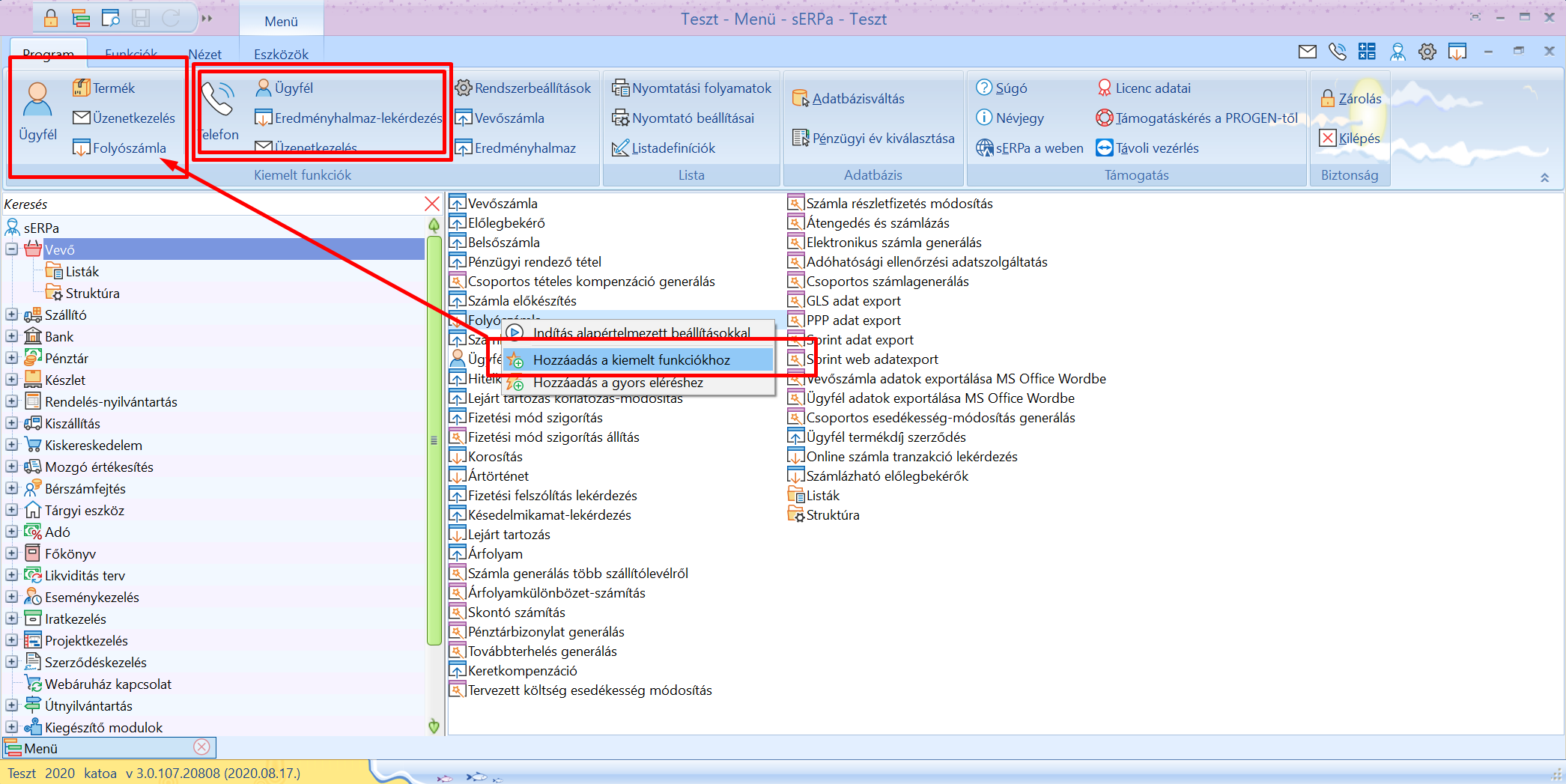 A felhasználónak lehetősége van jobb klikkel eltávolítani, vagy jobbra/balra mozgatni a funkciókat, illetve a menüben a funkciókon állva jobb klikkel a hozzá is tudja adni a kiemelt funkciókhoz.