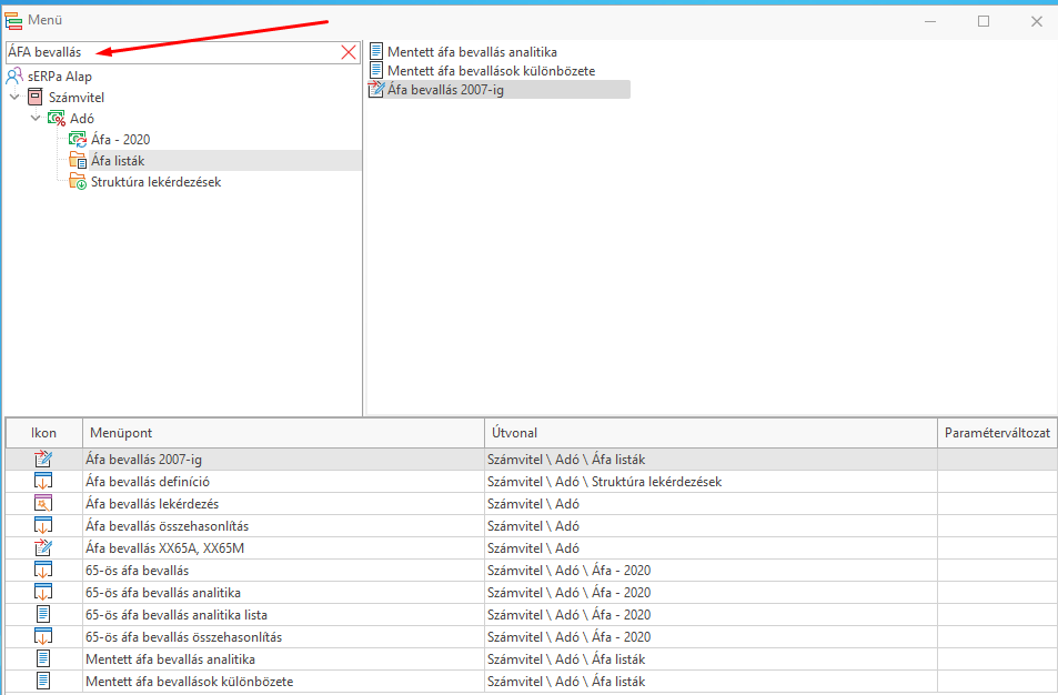 Ilyenkor a kurzor a baloldali Keresés mezőre ugrik, ide elkezdhetünk szöveget begépelni (a példában beírtuk, hogy ÁFA bevallás); a beírt szöveget tartalmazó funkcióneveket ilyenkor egy külön kis táblázatban megjeleníti a program; ahol kiválasztható - és elindítható - a keresett funkció: