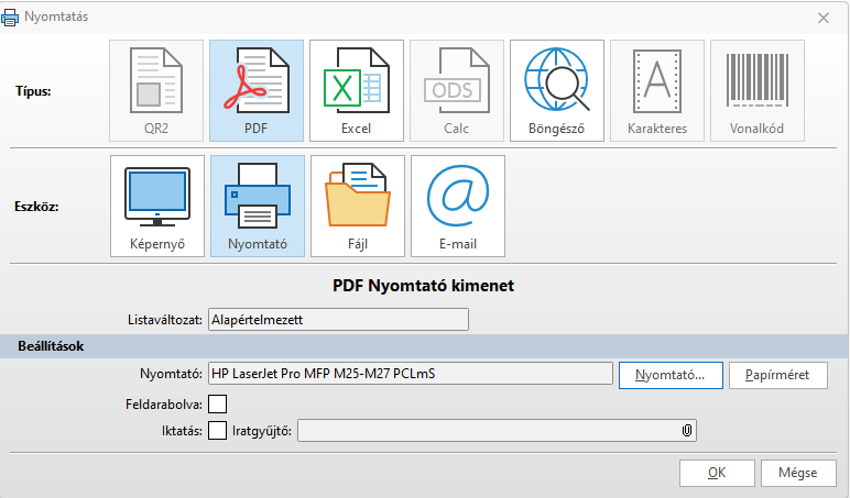 Az aktuális printer kerül kiírásra, amelyre történni fog a nyomtatás. A Nyomtató nyomógombbal választhatunk másikat. Ha van folyamatban nyomtatás, akkor "Kérem, várja meg, amíg a folyamatban lévő nyomtatás befejeződik!" szövegű üzenetet küld a program és csak akkor választható másik nyomtató, ha nincs folyamatban lévő nyomtatás. |
