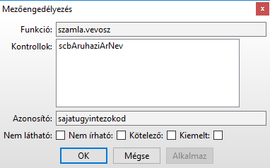 A Mezőengedélyezés ablakot menü módosítás üzemmódban lehet bekapcsolni. Az aktív (elindított) funkció mezőinek láthatóságát lehet vele szerkeszteni. Rá kell klikkelni az elindított funkcióban a szabályozni kívánt mezőre, táblázatra (elég a gridet, és a címkéjét felfenni a mezőengedélyezés ablakban, a gridben levő címkéket, oszlopokat külön-külön nem kell), címkére, vagy fülre. Ekkor beíródik a kontroll neve az ablak Kontrollok területére. A nem látható, vagy a nem írható, kötelező, vagy kiemelt pipa beállításával lehet meghatározni, hogy hogyan viselkedjen a mező. Az OK gomb hatására a funkció tulajdonságokba automatikusan felvételre kerül a mező-engedélyezés menüparaméter a beállítások szerinti paraméterezéssel. Nem felejtsük el, hogy a módosított menüt el is kell menteni. A program újraindítása után lép életbe a beállítás azoknak a felhasználóknak, akikhez az imént módosított menü van rendelve a felhasználó funkcióban. Ha egy mezőt nem láthatóvá tettünk, de később mégis szeretnénk megjeleníteni, akkor Mezőengedélyezés ablakban láthatjuk, hogy van ilyen "eltüntetett" mező és ott állíthatjuk vissza a láthatóságát. (A formon a nem láthatóra állított mezőkre nem tudunk ráklikkelni, mert azok nem jelennek meg.)