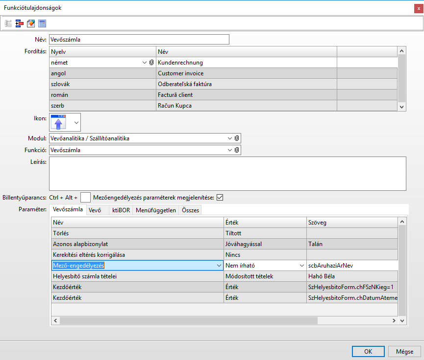 3.Csak olyan mezőt tudunk kötelezővé tenni amit a funkció nem bírál felül, pl. egy menüparaméter segítségével, például ha a funkciónak van „Alapbizonylatszám üresen hagyása” menüparamétere és Engedélyezett, akkor hiába állítottuk be az alapbizonylatra a kötelezőséget.