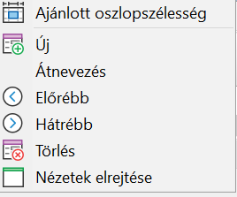 Ajánlott oszlopszélesség Ha ez ki van pipálva, és átméretezzük az ablakot, akkor ezt arányosan követik az oszlopszélességek. Új Rákattintva új fület hozhatunk létre, aminek megadhatjuk a nevét. ÁtnevezésLehetőségünk van átnevezni az új fület. Kattintsunk az Átnevezésre, majd gépeljük be az új nevet. Előrébb, hátrébbRendezhetjük a fület előrébb és hátrébb. TörlésLehetőségünk van törölni az adott fület: nyomjunk a Törlésre. Nézetek elrejtése Elrejthetjük a nézeteket a Nézetek elrejtése lehetőségre kattintva. |