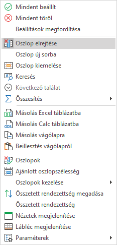 Ezekkel az almenükkel az összeállított táblázat beállítások elmenthetők adatbázisba, amit más felhasználók is betölthetnek és használhatnak. (Ugyan abban a táblázatban, amelyben el lett mentve a beállítás.)