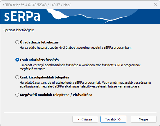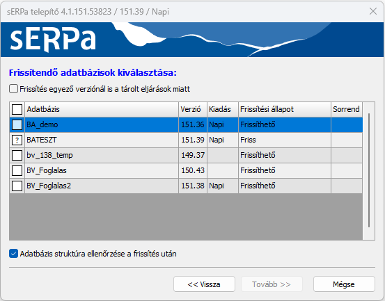 Ezzel a művelettel a korábban már frissített sERPa programnak megfelelő verzióra frissíthetjük az adatbázist. Jellemzően akkor használjuk, amikor a verziófrissítéskor egy vagy több adatbázis kimaradt a frissítésből.