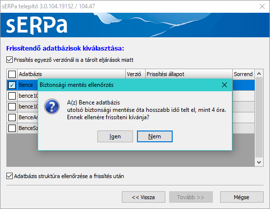 A 4 óránál régebbi mentés esetén veszélyes adatbázist frissíteni, ez a felhasználó saját felelőssége. (Ez az ellenőrzés csak akkor történik meg, ha maga az adatbázis 1 hétnél régebbi. Induló sERPa adatbázis esetén hasznos, amikor még lényeges adatai nem lehetnek a felhasználónak.)
