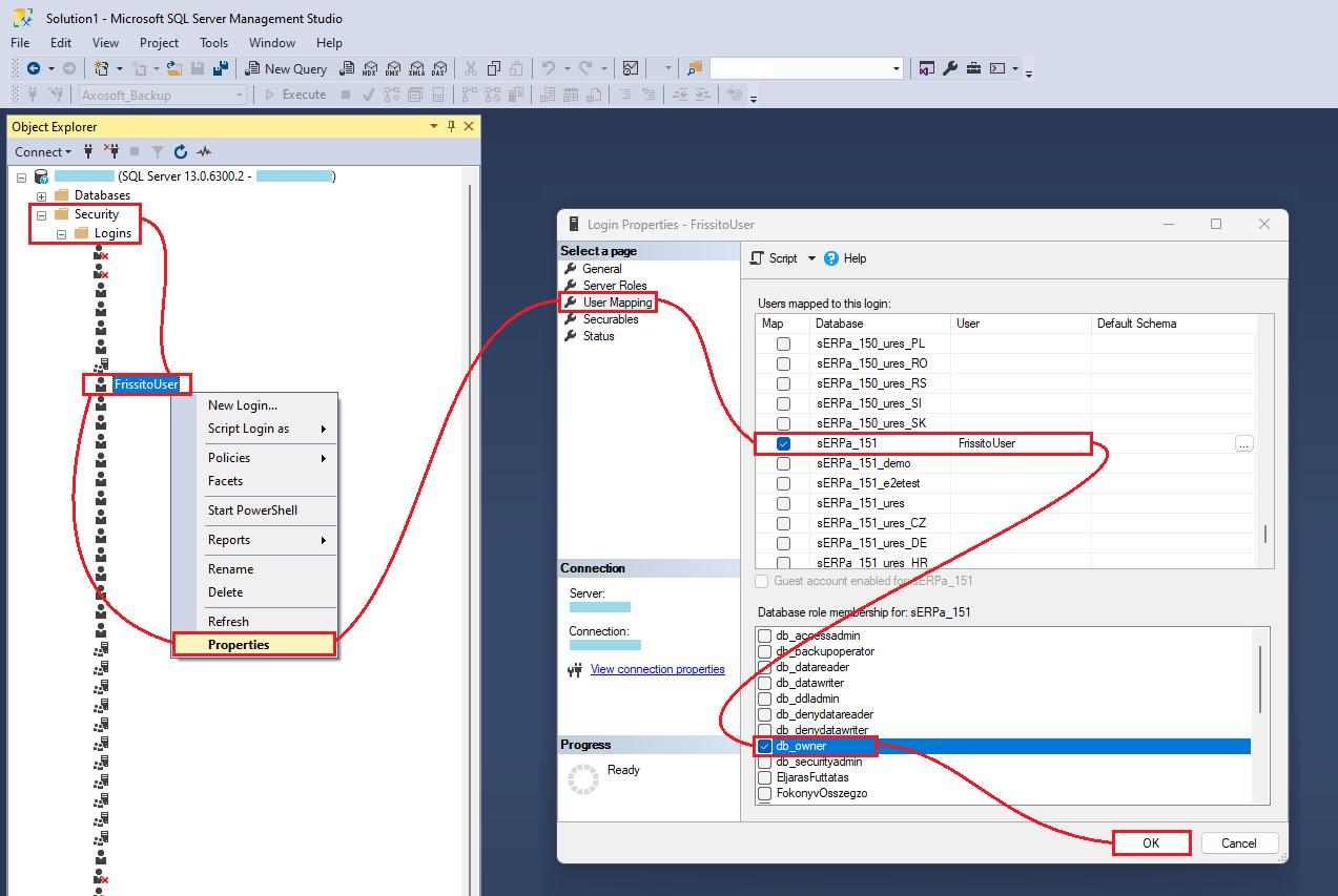 A SQL Server Management Studioban a Security / Logins (kijelölve azt a 'Login'-t, akiként frissítünk) tulajdonságaiban a User mapping fülön a frissítendő adatbázisnak kipipálva kell lennie és a 'Database role membership' alsó táblázatban a public mellett a db_owner-t is ki kell pipálni.