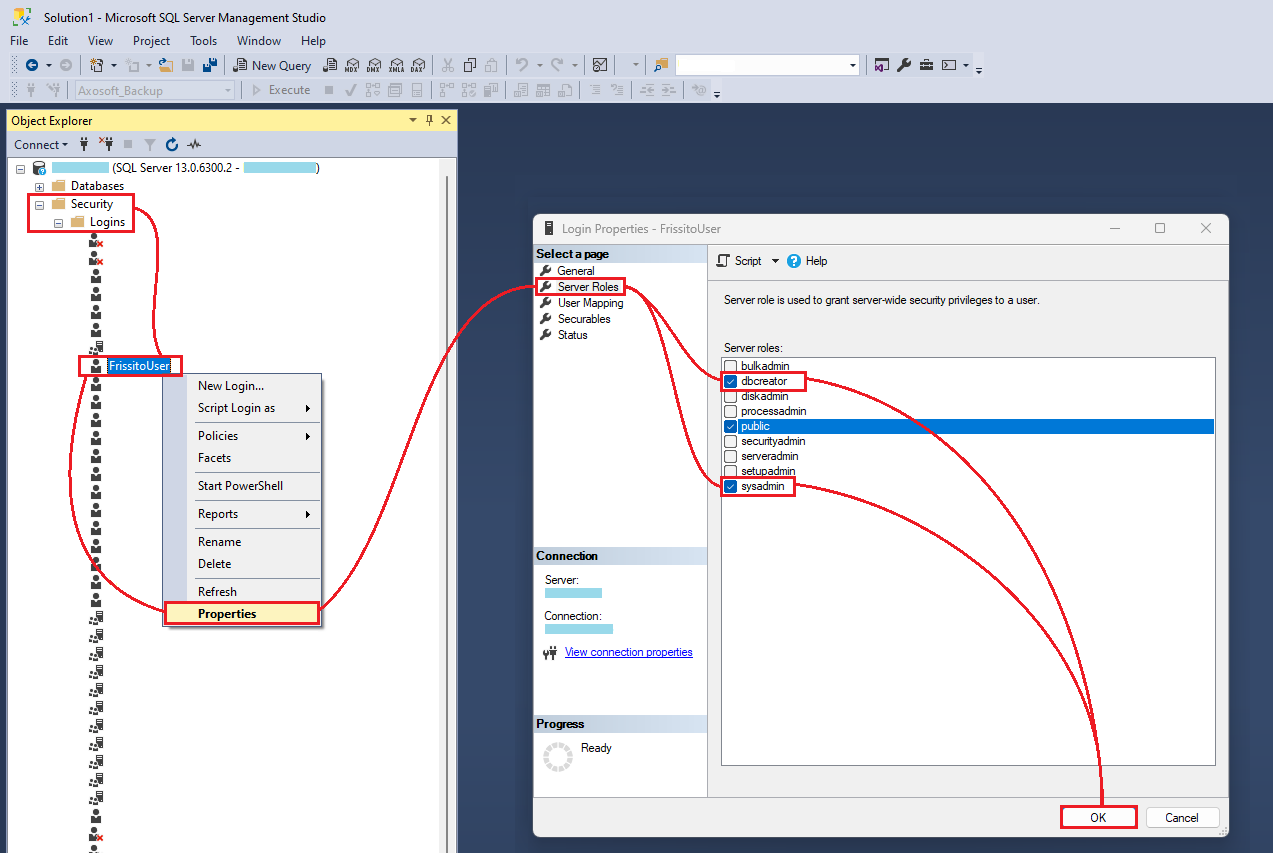 •Továbbá a 'Server Roles' fülön a server role-ok között vagy a 'sysadmin' vagy a 'dbcreator' Server Role-nak is kipipálva kell lennie.
