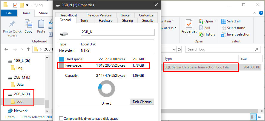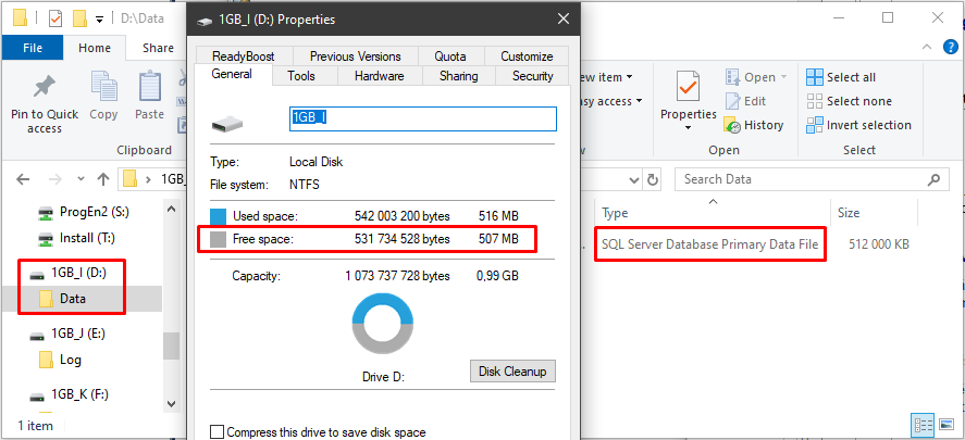 ebben a példában nem áll elegendő szabad terület rendelkezésre a Data fájlnak: