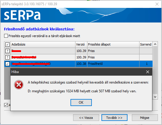 B) A telepítő az adatbázisok kiválasztása után a Tovább gomb megnyomásakor megkeresi az adatbázisokhoz tartozó data (.MDF) és log (.LDF) fájlokat, és megvizsgálja, hogy abban az esetben, ha a két fájl egy helyen van akkor összesen 1 GB / adatbázis, amennyiben külön meghajtókon/partíciókon vannak, akkor fájlonként 1-1GB / adatbázis szabad terület áll-e rendelkezésre. Addig nem engedi a frissítést lefuttatni, amíg nem szabadítunk fel elegendő szabad területet.