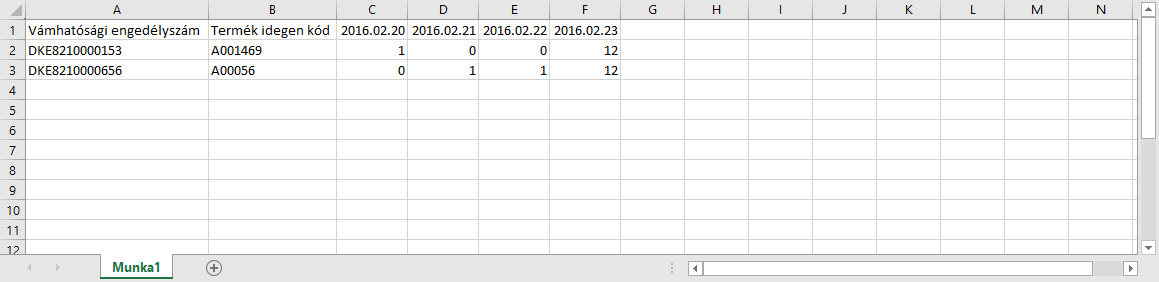 Működési engedély szám, Termék idegen kód, Dátum 1., Dátum 2., Dátum 3., ..., Dátum 30.
