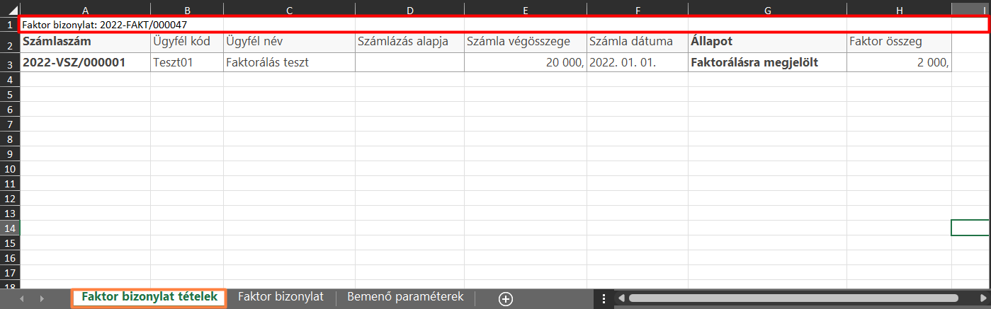 Azonban használható a Faktorálásra megjelölés funkció után létrejött Faktorbizonylat eredményhalmaz kiimportált Excel fájlja is. Ebben az esetben is csak a kötelező oszlopok kerülnek beolvasásra, a többi oszlop nem. Importálás előtt néhány módosítást végre kell hajtani az Excel file-on, hogy sikeres legyen a beolvasás: