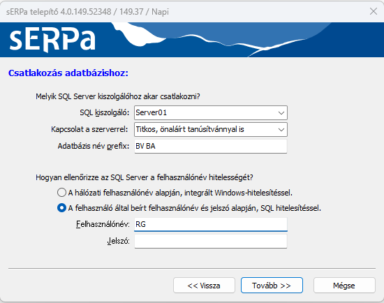A Tovább gomb hatására a szerverhez való csatlakozásnál leírtak szerint kell megadnunk a kapcsolódási adatokat. A Csak adatbázis frissítése fejezetben leírtak szerint megadhatjuk az adatbázis prefixet is, ha sok adatbázis közül kell választanunk.