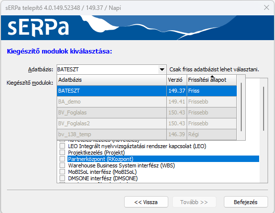 Fontos, hogy Kiegészítő modult csak friss, azaz a telepítővel megegyező verziószámú adatbázishoz tudunk telepíteni.