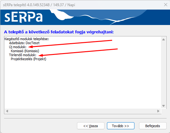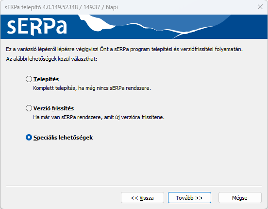 Ezt a műveletet szükséges használni, amikor olyan sERPa modult vesz használatba a felhasználó, mely külön, kiegészítő modulként szerepel a telepítő készletben. Ezek a modulok a sERPa olyan funkcionalitását tartalmazzák, melyet nem minden partnerünk használ. Ezeket a komponenseket nem telepítjük fel alapértelmezetten a sERPához; hely- és időmegtakarítási céllal választottuk külön a telepítésüket.