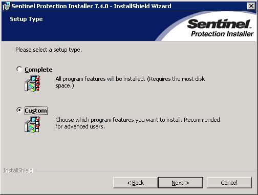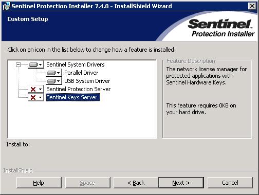 Egyéni/Customer telepítést választva kell feltenni a Parallel Driver és az USB System Driver-t. A többi részt nem érdemes feltenni (felesleges, de nem okoz hibát, csak feleslegesen foglalja majd szervizként a rendszer erőforrásait.), így ezeken a többi telepíthető részeken a lenyíló mezőre kattintva a "This feature will not be available" beállítást kell választani, amitől megjelenik a piros X ezekben a sorokban és nem települnek ezek a szerverek. (Sentinel Protection Server, Sentinel Keys Server)