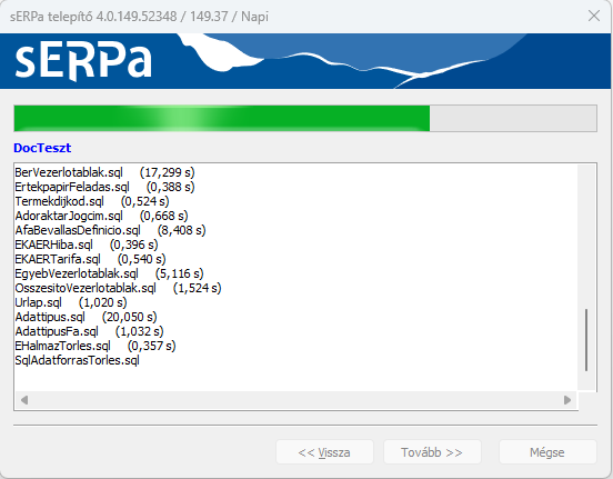 A végrehajtás során egy folyamatjelző csík látszik, követhető, hol tart a folyamat. A csík alatt az éppen létrehozandó, frissítendő adatbázis neve kiemelten látható, ez hasznos információ, amikor több adatbázist érintő művelet van folyamatban.