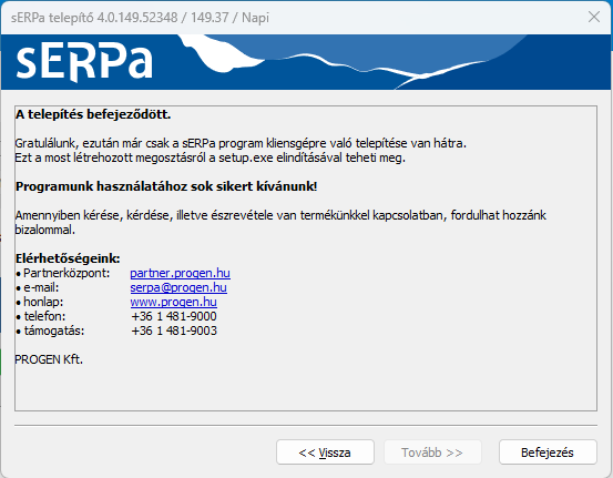 A telepítési folyamat egy elköszönő képernyővel zárul, ahol a hátralévő feladatok és legfontosabb elérhetőségeink találhatók:
