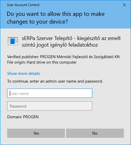 Ez esetben az Install_Elevated.exe rendszergazda jogosultságú felhasználótól jogosultsági szint emelést, míg normál felhasználótól rendszergazda jogosultságú fiókot kér be a szokásos Windows jelszókérő ablakban.