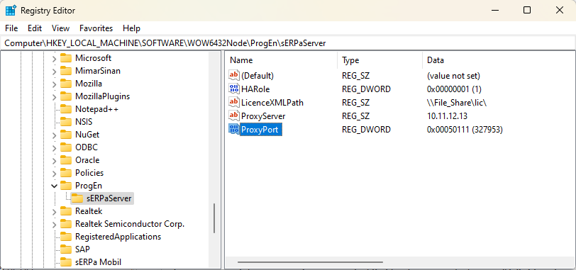 A paramétereket a következő registry kulcs alá kell felvenni: HKEY_LOCAL_MACHINE\SOFTWARE\WOW6432Node\ProgEn\sERPaServer