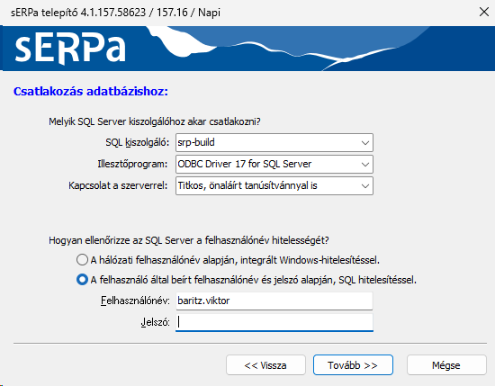 Az SQL szerverhez való csatlakozáshoz meg kell adni az SQL kiszolgáló nevét, a szerverrel való kapcsolat titkosítottságát, valamint a hitelesítésünk módját. Windows-hitelesítést választva a telepítést végző felhasználó neve jelenik meg a Felhasználó név mezőben.