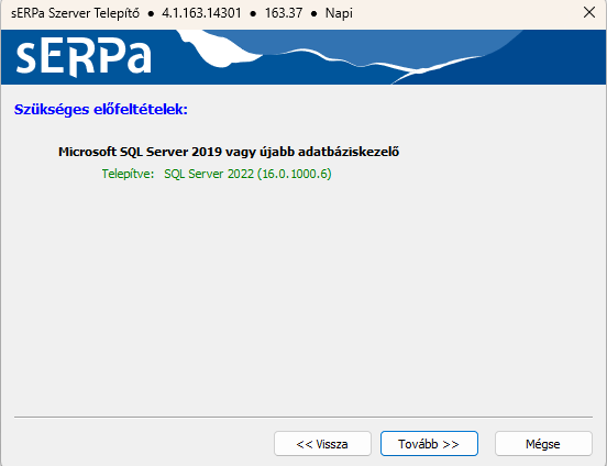 A Telepítő a megadott adatbázis szerver verzióját ellenőrzi, és ha az nem felel meg a szoftverkövetelményeknél leírt verziónak, akkor a Telepítő hibaüzenetet ad.