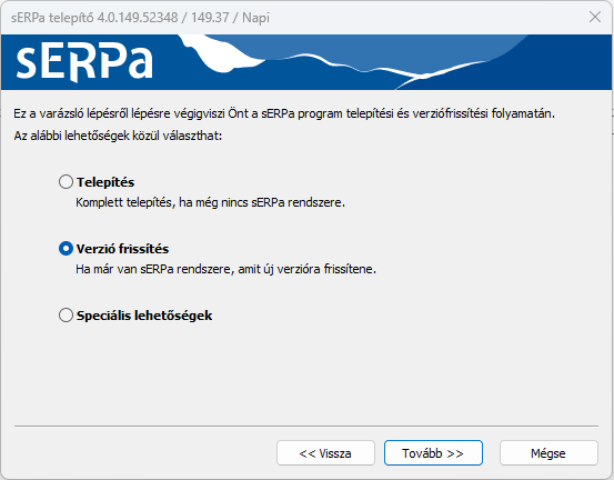A Telepítő varázsló (install.exe) Verziófrissítés funkcióját akkor használjuk, amikor már van sERPa telepítve, és azt egy újabb verzióra kívánjuk frissíteni.