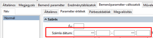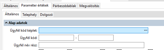 Láthatjuk, hogy van köztük keresés, képlet, Név és kód adat, példaként az eredményhalmaz bemenő paraméterekben szűrésként az ügyfélkód képlet, az ügyfélkódra egy intervallum szűrés, valamint az Ügyfélnév részre egy szűrés: