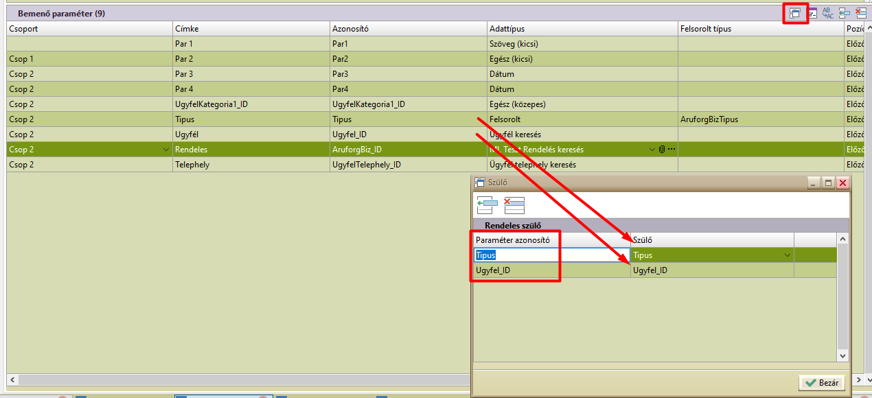 Az Eredményhalmaz készítésénel a szülő formon (ez esetben a szülő kontroll üres marad) kell összerendelni a paraméter azonosítókat (# nélkül) a párbeszédablakon levő kontrollokkal.