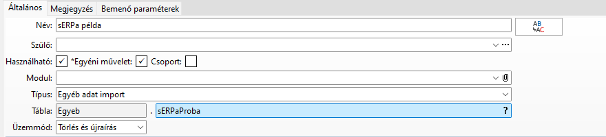A művelet bevitel funkcióban az "Egyéb adat import" típust kell használni. A típust kíválasztva megjelennek a Tábla és Üzemmód mezők. A tábla / séma mező értéke nem változik. A név mezőben kell megadni az adattábla nevét: