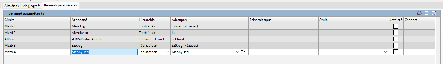 A bemenő paraméterek fülön adhatók meg a táblázat oszlopainak nevei és típusai. A felhasználó a többi beviteli funkcióhoz hasonlóan saját maga határozhatja meg a mezők adattípusát, hierarchiáját, azonosítóját stb..