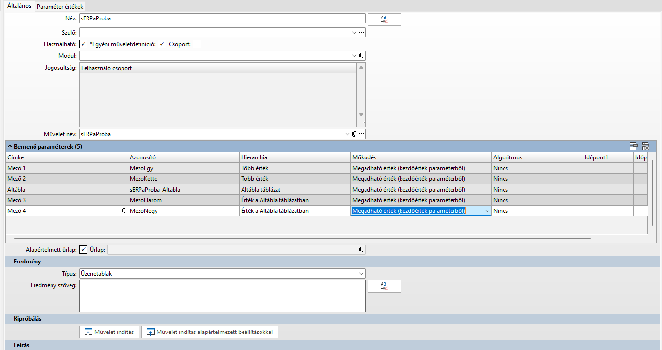 A létrehozott műveletet a szokásos módon lehet felhasználni a sERPában. Például műveletetfunkciót definiálhatunk vele. A beviteli funkcióban megadott módon fogja az adatokat felvenni a művelet. A kiválasztást követően a Bemenő paraméterek grid automatikus feltöltésre kerül a műveletben definiált mezőkkel: