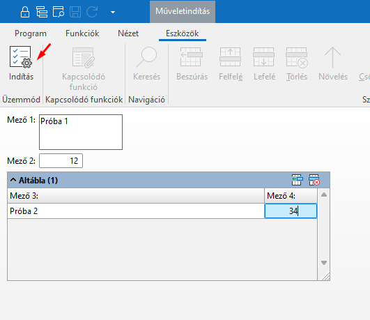 Rögzítést követően a Művelet indítására kattintva megjelenik az űrlap. A mezők kitöltését követően az Indítás gombra kattintunk, ekkor az adatbázis táblákba feltöltésre kerülnek az adatok.