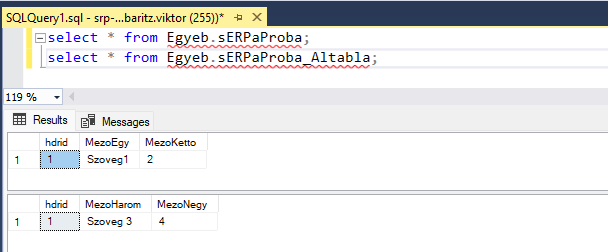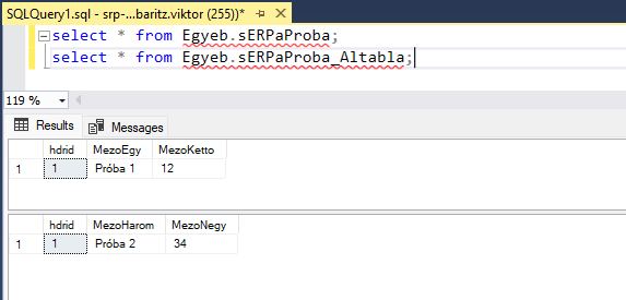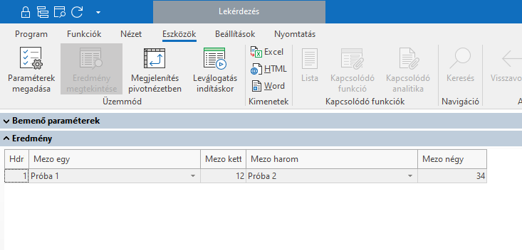 Eredményként az adatforrás mezőit kell megadni. A továbbiakban a szokott módon létre hozzuk az eredményhalmazt majd lekérdezzük az 1-es ID-re. A megjelent eredmény a táblában és az altáblában lévő értékek:
