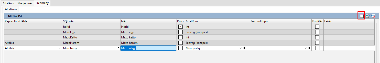 Végül az eredmény fülön a táblázatba be kell szúrni azokat a mezőket, amiknek az eredményét szeretnénk majd a lekérdezésekhez használni. Ezt megthetejük egyesével vagy a grid jobb felső sarkán lévő gombbal egyszerre betölthetjük. Az altábla mezőit minden esetben kézzel kell hozzá adni a táblázathoz: