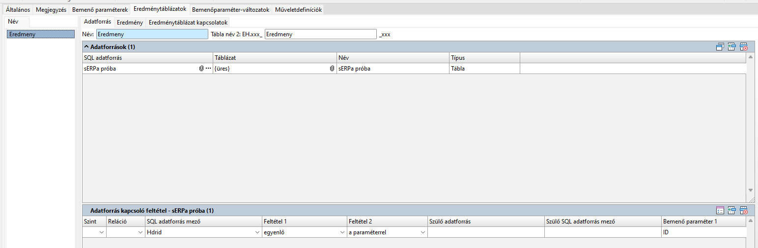 Az elkészített adatforrást használhatjuk Eredményhalmaz lekérdezés definiálásához. Az Eredmény táblázatok fülön az elkészített adatforrást kell megadni. Példánkban az ID-re fogunk szűrni, tehát az alatta lévő Adatforrás kapcsolódó feltétel gridben a bemenő paraméterként megadott ID mezőt kell megjelölni és az feltételt egyenlőre állítani.