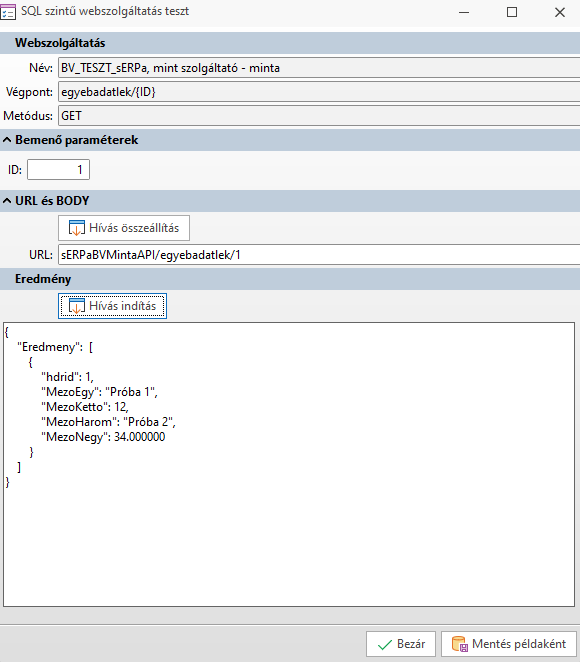 A sERPából való lekérdezéshez felhasználhatjuk a definiált eredményhalmazt. Az api végpont definíciójában kell megadni az eredményhalmazt, a végpontban pedig a bemenő paraméter szűrésre használt mezőjét. Lekérdezést követően JSON vagy XML objektumban kapjuk meg az eredményt: