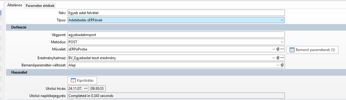 A sERPának való adat átadás szintén a megszokott módon történik. A definícióban kell megadni a műveletet, amit látrehoztunk. Az adatok az Egyeb sémában létrehozott táblába és altáblába kerülnek. A válasz eseményben megadhatók az új adatforrás mezői is. Ehhez olyan eredméynhalmazt kell létrehozni, melyben az egyik adatforrás a Egyéb adat import eredmény a másik pedig a felhasználó által létrehozott új adattábla.