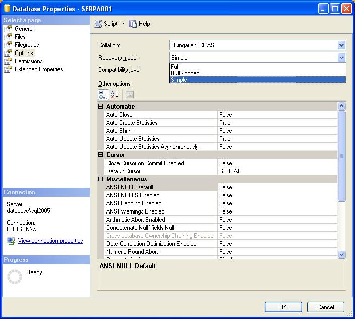 Az adatbázis létrehozása után célszerű beállítani, hogy a logfile mérete ne folyton növekedjen (mert mindig hozzáírja az új adatokat az SQL), hanem amit már biztosan elmentett, annak a logolását törölje magának. Ezt a Microsoft SQL Server Management Studio Express program elindításával a szerverre való rákonnektálás után az adatbázison nyomott jobbegér Properties menüpont elindítása után megjelenő ablakban érhetjük el az Options területen a Recovery model mező értékének Simple értékre állításával. Ezt beállítva a logfájlhoz nem hozzáíródik az új log adat, hanem a már nem használt kitörlődik és helyette beíródik az új. Viszont, ha egyszer már megduzzadt a logfile, akkor annak a mérete ettől nem fog lecsökkenni, hanem csak az általa már elfoglalt helyre fog írogatni az SQL. Ha többet akar beleírni, mint amennyi itt a hely, akkor megnöveli, de utána vissza már nem csökkenti a fájl méretét! Az egyszer már hatalmasra dagadt log file-t schrinkeléssel lehet megszüntetni, aminek a leírását lásd a vonatkozó fejezetben.