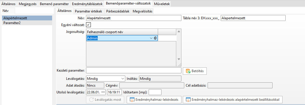 - Ha a tábla üres vagy a felhasználónak nincs jogosultsága az eredményhalmaz futtatásához abban az esetben nem jelenik meg az Eredményhalmaz-lekérdezés legördülő listájában az Eredményhalmaz. Amennyiben a jogosultság tábla nem üres akkor megjelenik a Bemenőparaméter-változat és az eredményhalmaz is az Eredményhalmaz-lekérdezés funkcióban, ha a felhasználónak van rá jogosultsága. Ha több Bemenőparaméter -változat van egy eredményhalmazhoz, akkor az eredményhalmaz kiválasztható de csak a jogosultsággal rendelkező változat látható a listában, például: