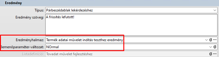 A művelet végrahajtásának eredményét táblázatban megjelenítő Eredményhalmaz választása. Nem használható a mező a Funkció és a Listaindítás típusok esetén. |